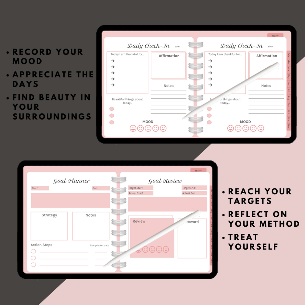 The whole planner is hyperlinked for easy navigation. We have made templates for mental and physical health, productivity and finances. These templates can easily be duplicated and added to any section of the planner